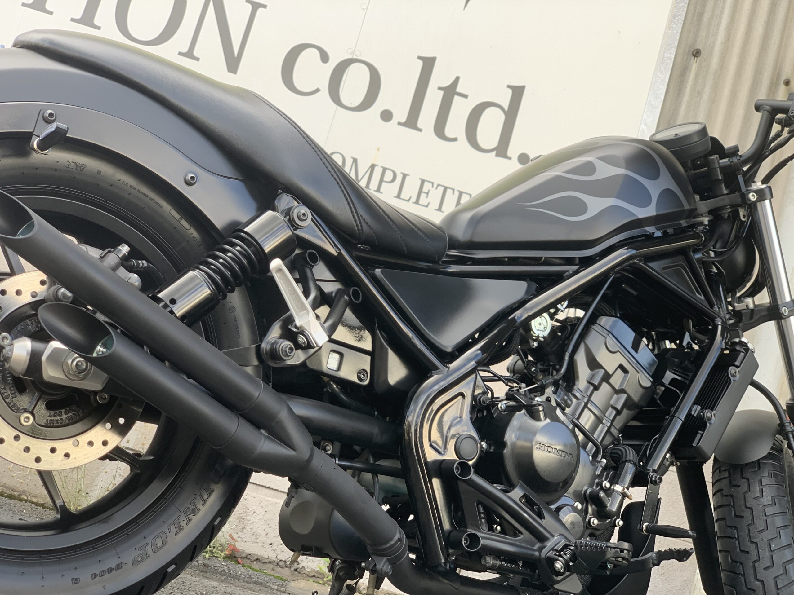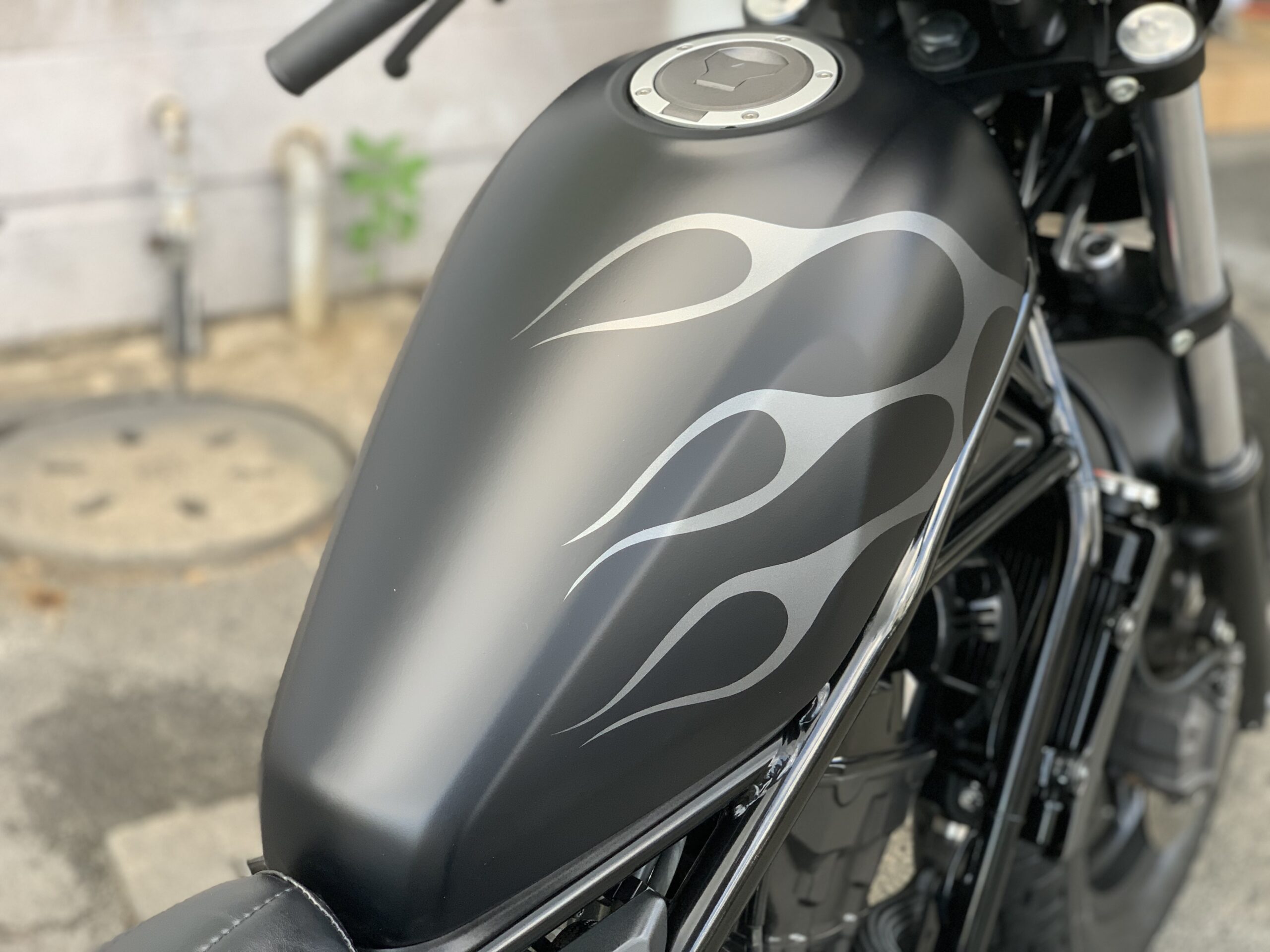 タンクにはシルバーのフレイムスを施し、ワンオフで制作した2本出しのスラッシュカットマフラーが悪い雰囲気を醸し出し、coolな車両に仕上がりました☠️