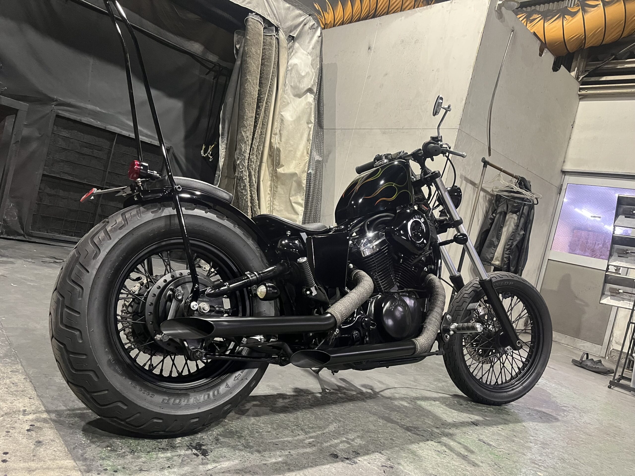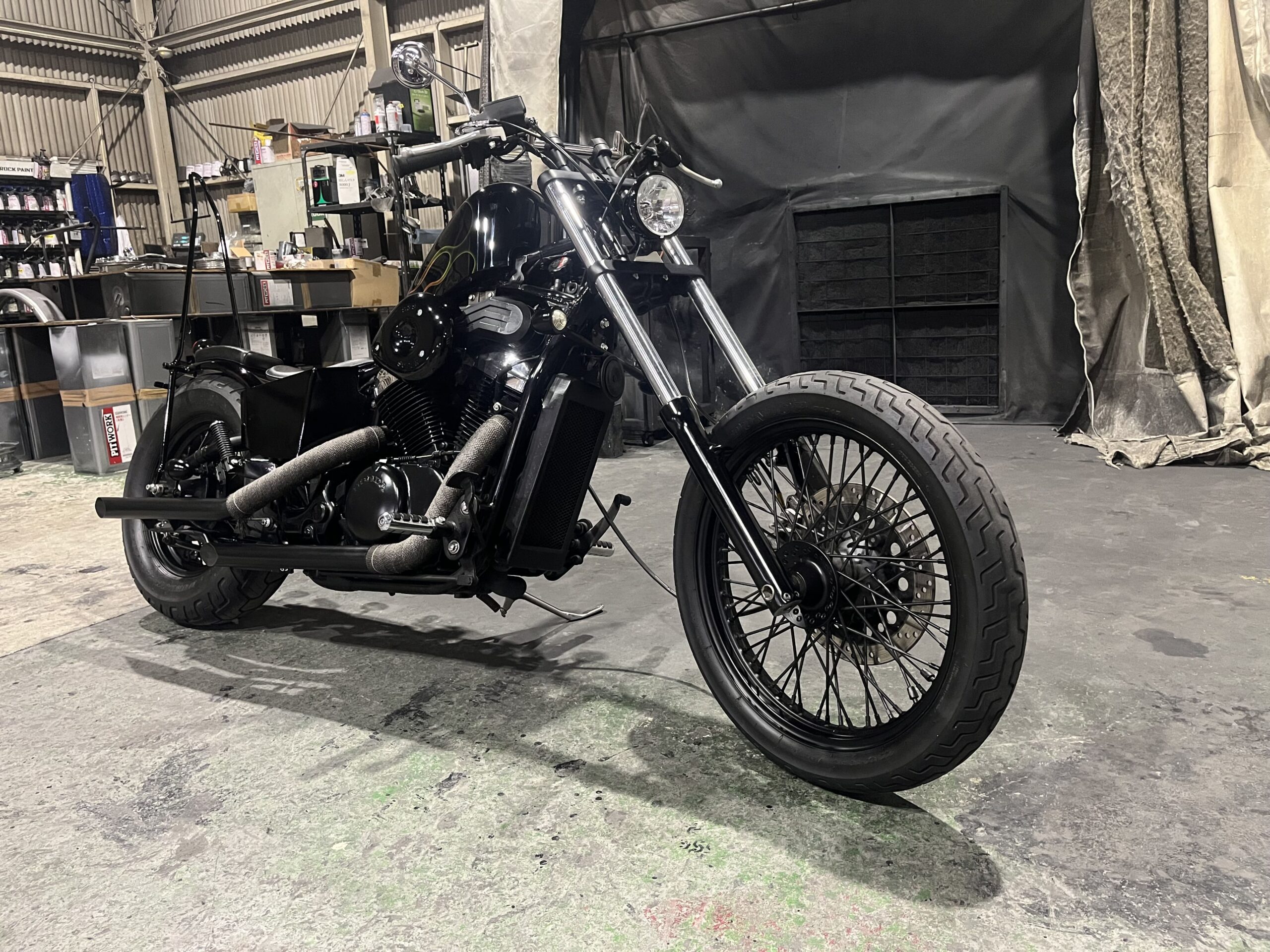 ロングフォークにシーシーバー、スラッシュカットマフラーと王道チョッパーカスタムが詰まった車両となっております。
