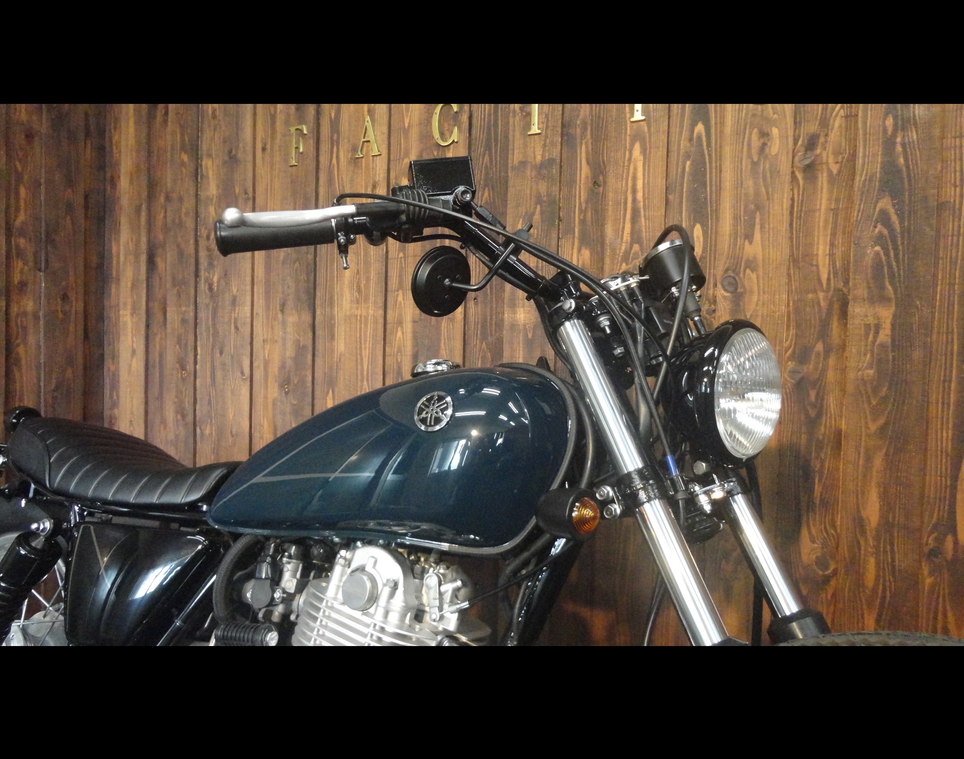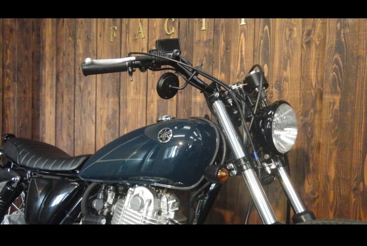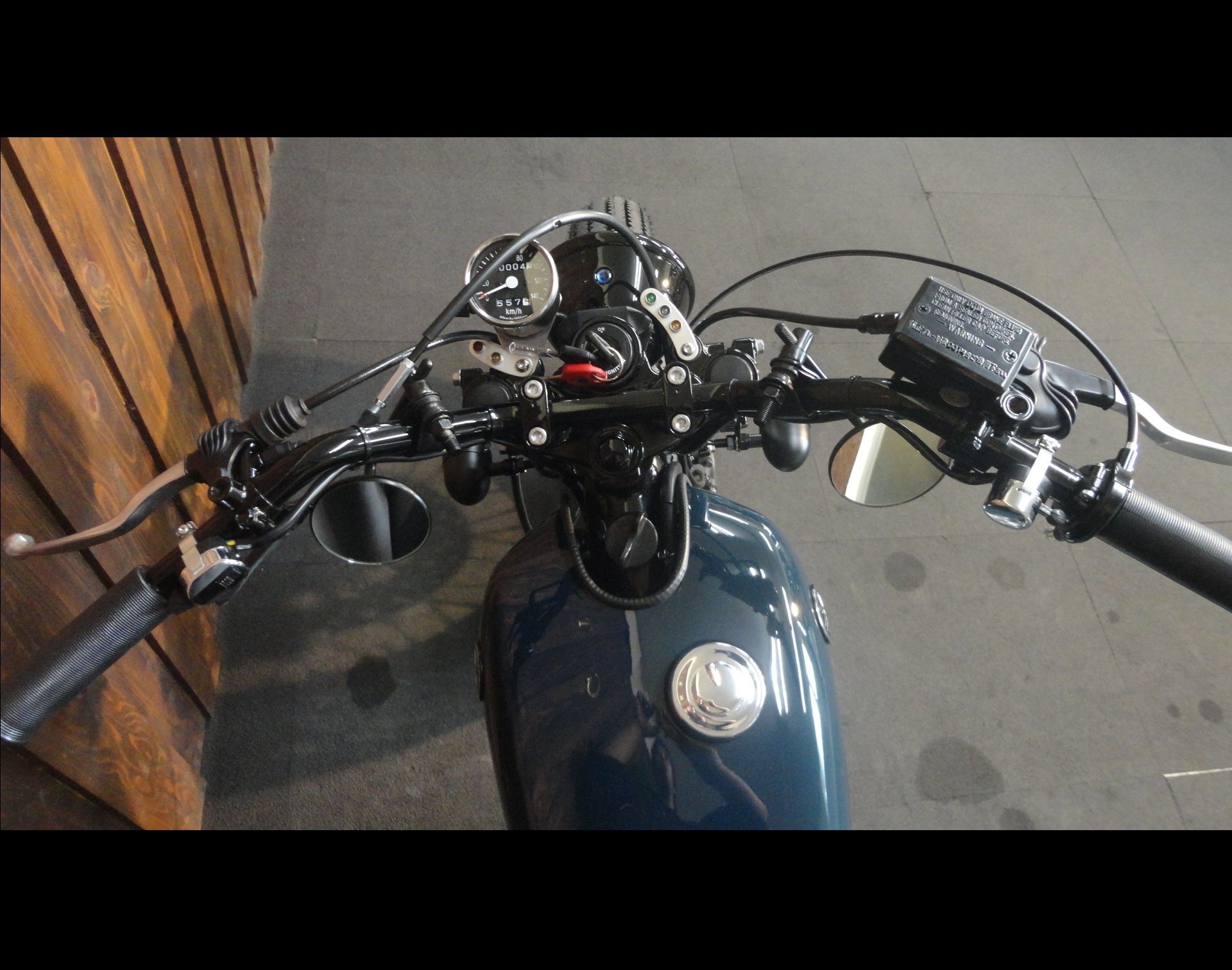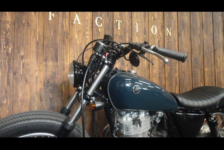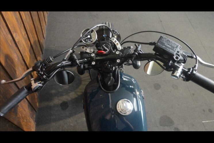 5.75inのベイツライトにオールドレーサー風のハンドル、左右にはクランプミラーをチョイスして、スイッチ類も変更してスッキリとしたハンドル廻り★